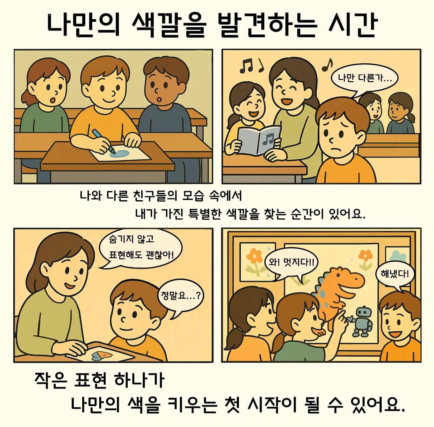 선생님, 아이들에게 '나만의 색깔로 세상을 채우는 용기'를 가르치는 것은 건강한 자존감과 긍정적인 자아 정체성 형성에 도움을 줍니다.