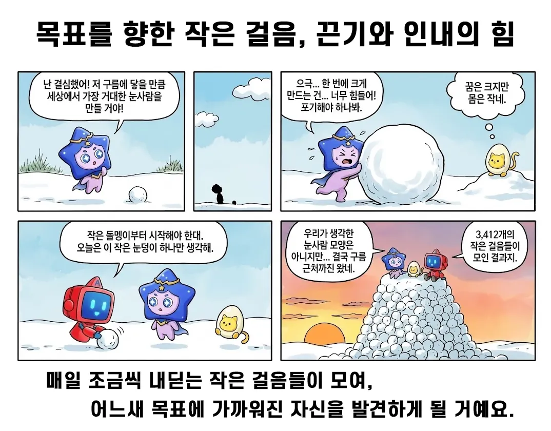 오늘 선생님의 교실에, 큰 목표를 설정하고 그것을 달성하기 위해 작은 단계로 꾸준히 나아가는 '끈기와 인내의 힘'에 대한 메시지를 전해드립니다. 바로 '목표를 향한 작은 걸음, 끈기와 인내의 힘'에 대한 이야기입니다.