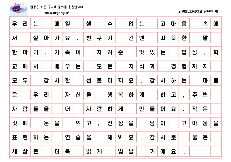 아이들의 작은 손에서 시작되는 감사의 필사가 교실의 공기를 바꾸고, 마음을 따뜻하게 물들일 수 있도록.